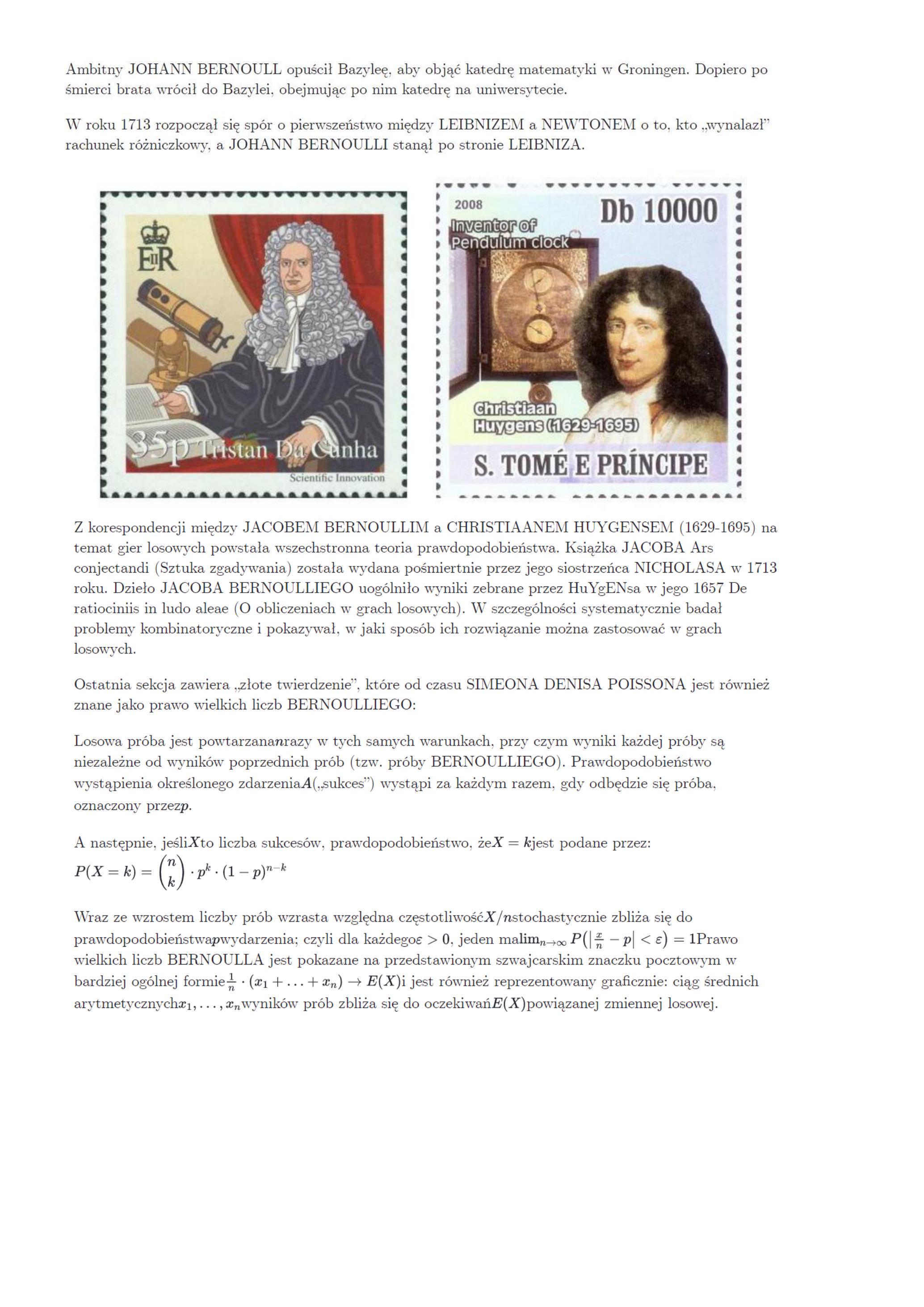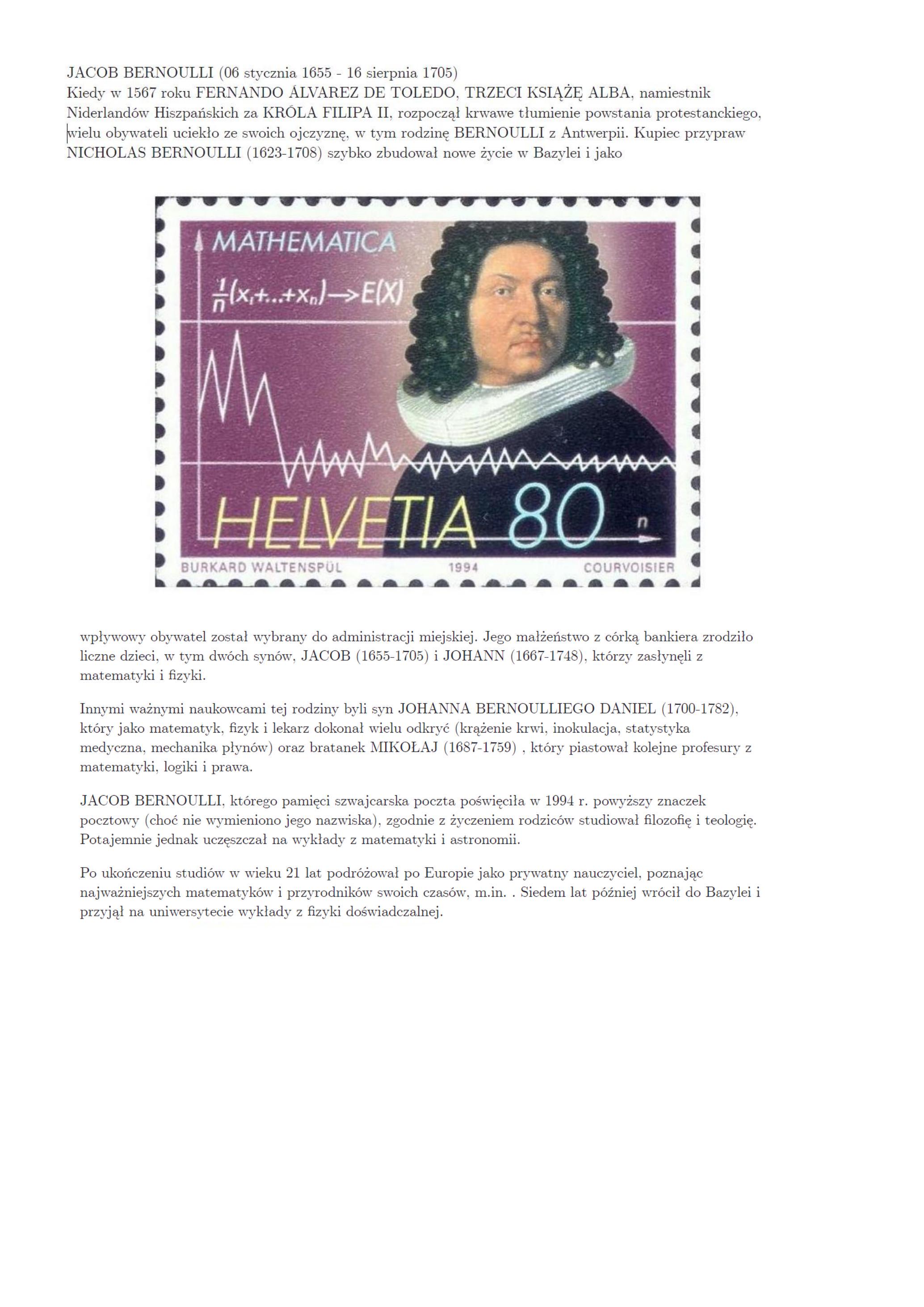 JACOB BERNOULLI, którego pamięci szwajcarska poczta poświęciła w 1994 r. powyższy znaczek pocztowy (choć nie wymieniono jego nazwiska), zgodnie z życzeniem rodziców studiowal filozofię i teologię. Potajemnie jednak uczeszczał na wykłady z matematyki i astronomii.