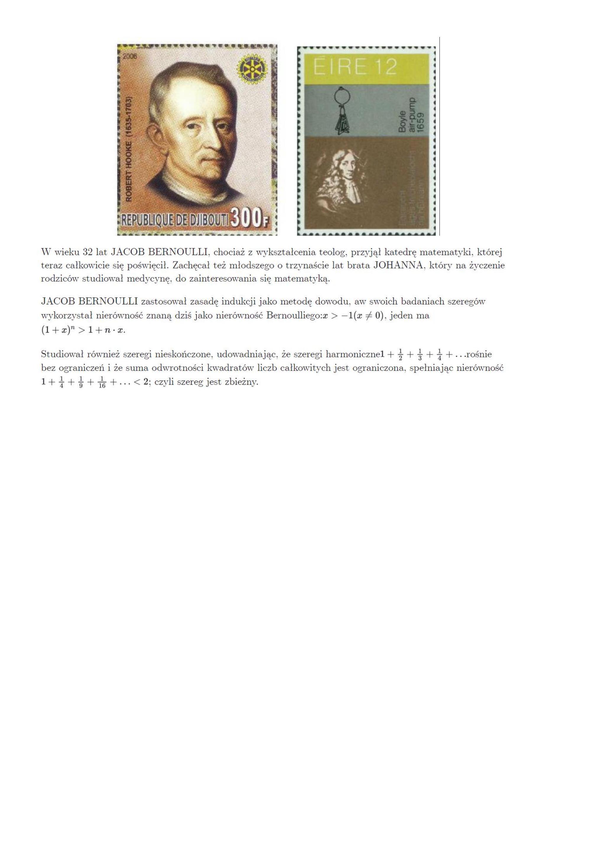JACOB BERNOULLI zastosował zasadę indukcji jako metodę dowodu, a w swoich badaniach szeregów wykorzystał nierówność znaną dziś jako nierówność Bernoulliego: (1+x)^(n) > 1+n*x(1+x)^{n}>1+n \cdot x