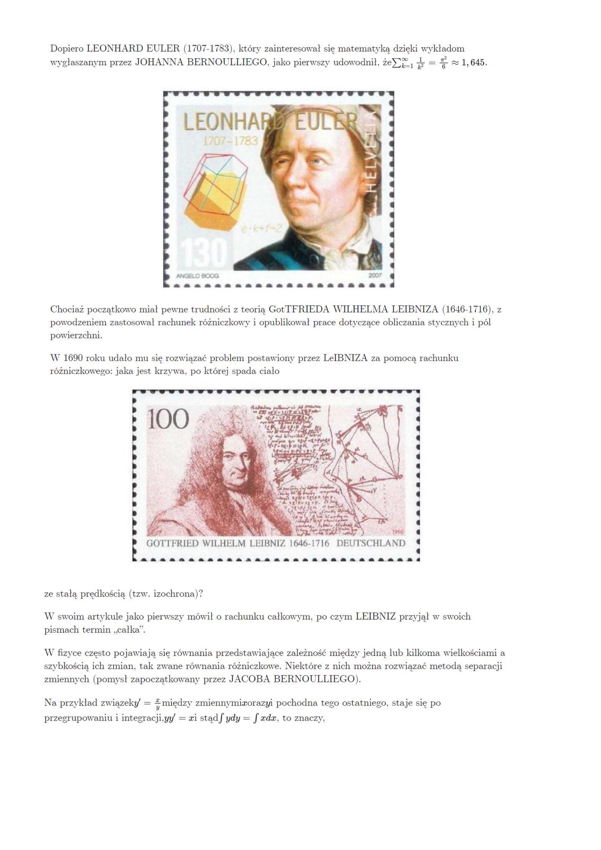 czyli szereg jest zbieżny. Dopiero LEONHARD EULER (1707-1783), który zainteresował się matematyką dzięki wykładom wygłaszanym przez JOHANNA BERNOULLIEGO, jako pierwszy udowodnił, że sum_(k=1)^(oo)(1)/(k^(2))=(pi^(2))/(6)~~1,645\sum_{k=1}^{\infty} \frac{1}{k^{2}}=\frac{\pi^{2}}{6} \approx 1,645.