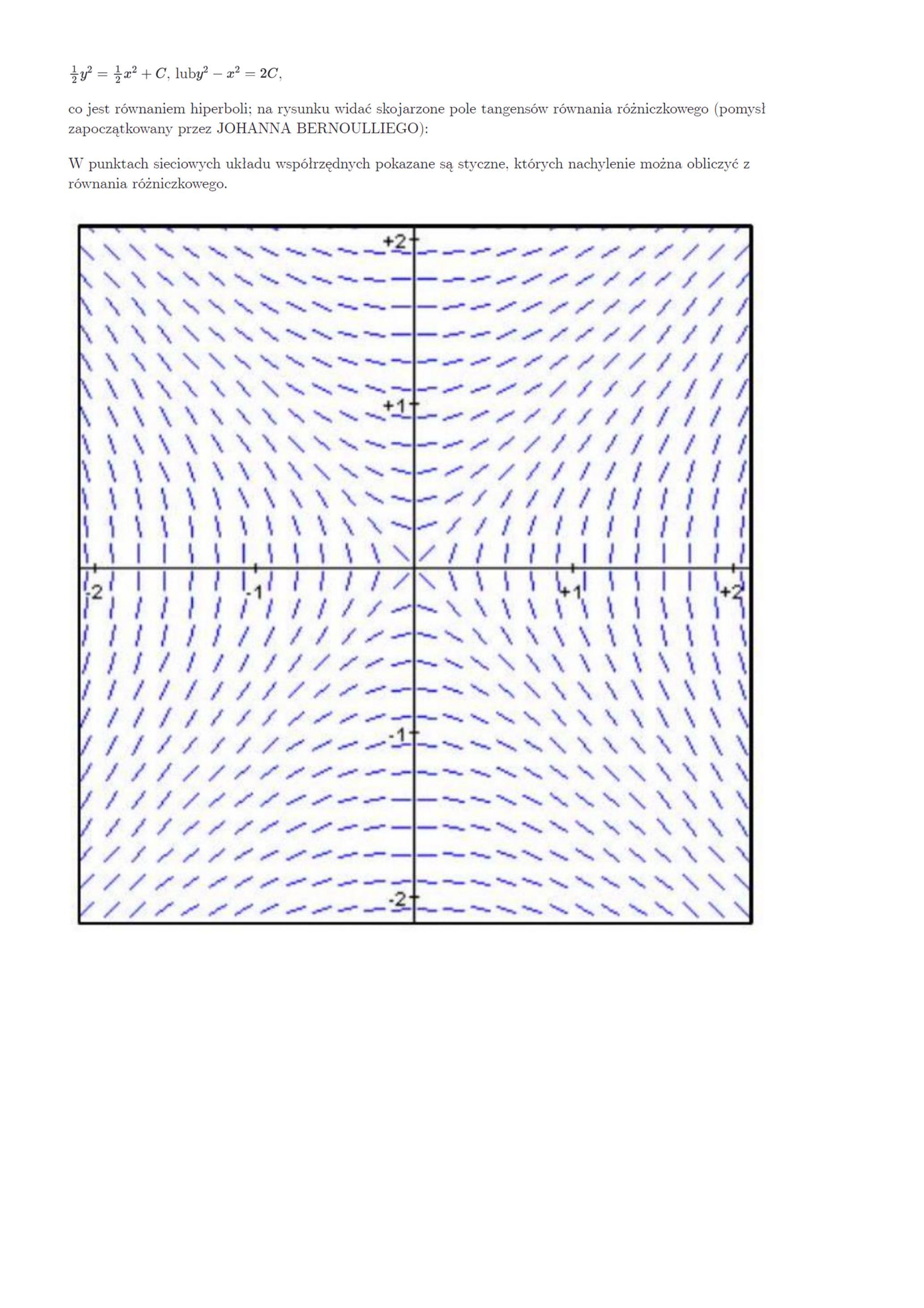 co jest równaniem hiperboli; na rysunku widać skojarzone pole tangensów równania różniczkowego (pomysł zapoczątkowany przez JOHANNA BERNOULLIEGO):